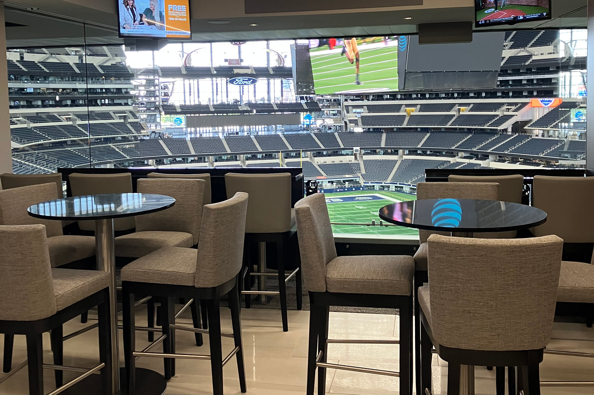 There are 10 private stadium clubs for Cowboys suite ticket holders at AT&T Stadium. Depending on which Cowboys suite you purchase, your access to certain clubs will vary. Most include cash bars, concessions and private restrooms. Optum and Owners Clubs are all-inclusive food and beverage.