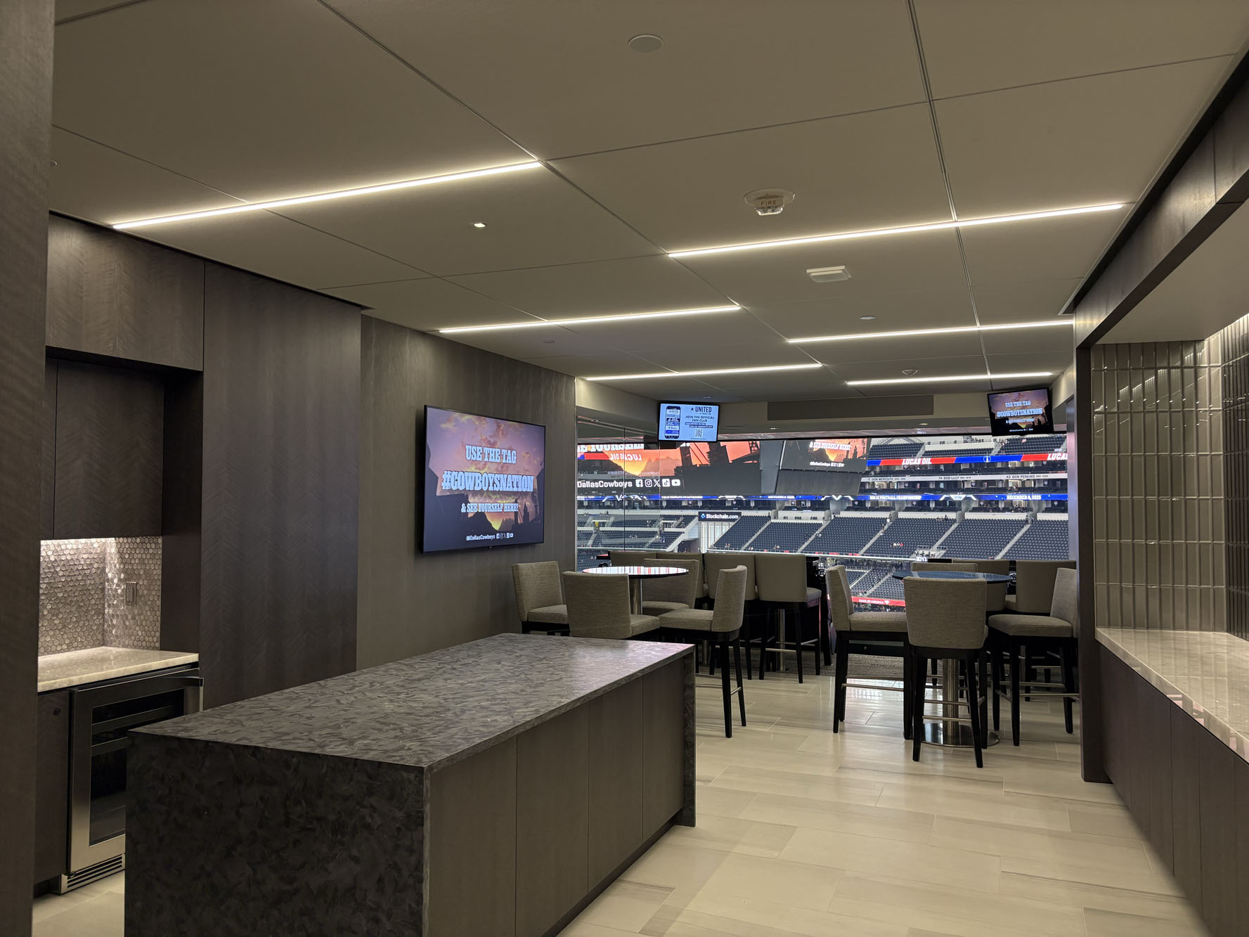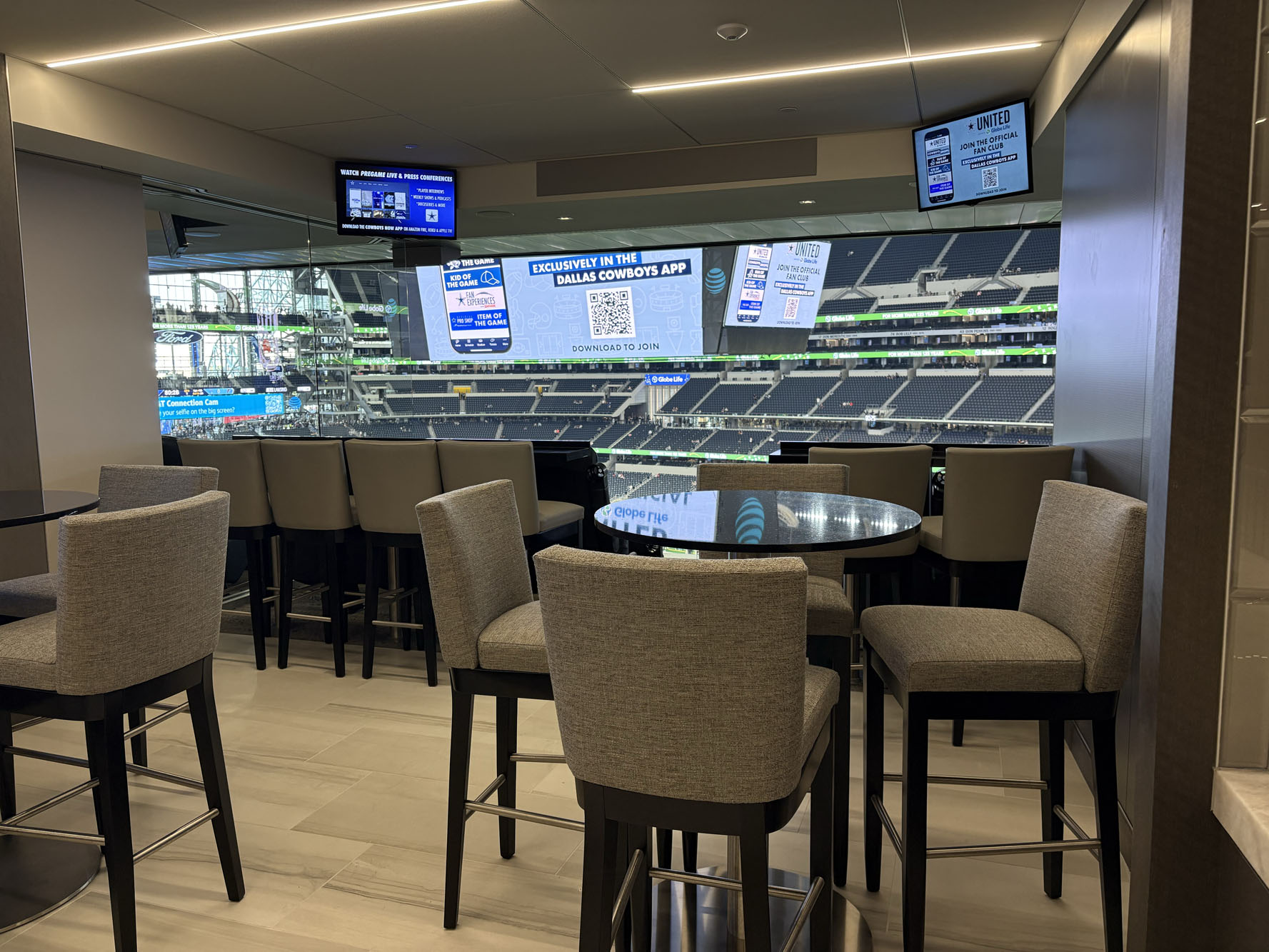There are 10 private stadium clubs for suite ticket holders at AT&T Stadium. Depending on which suite you purchase, you will have access to two or more club areas. Your suite ticket will provide you with entry into these exclusive stadium clubs. Suite guests often enjoy mingling here before events.